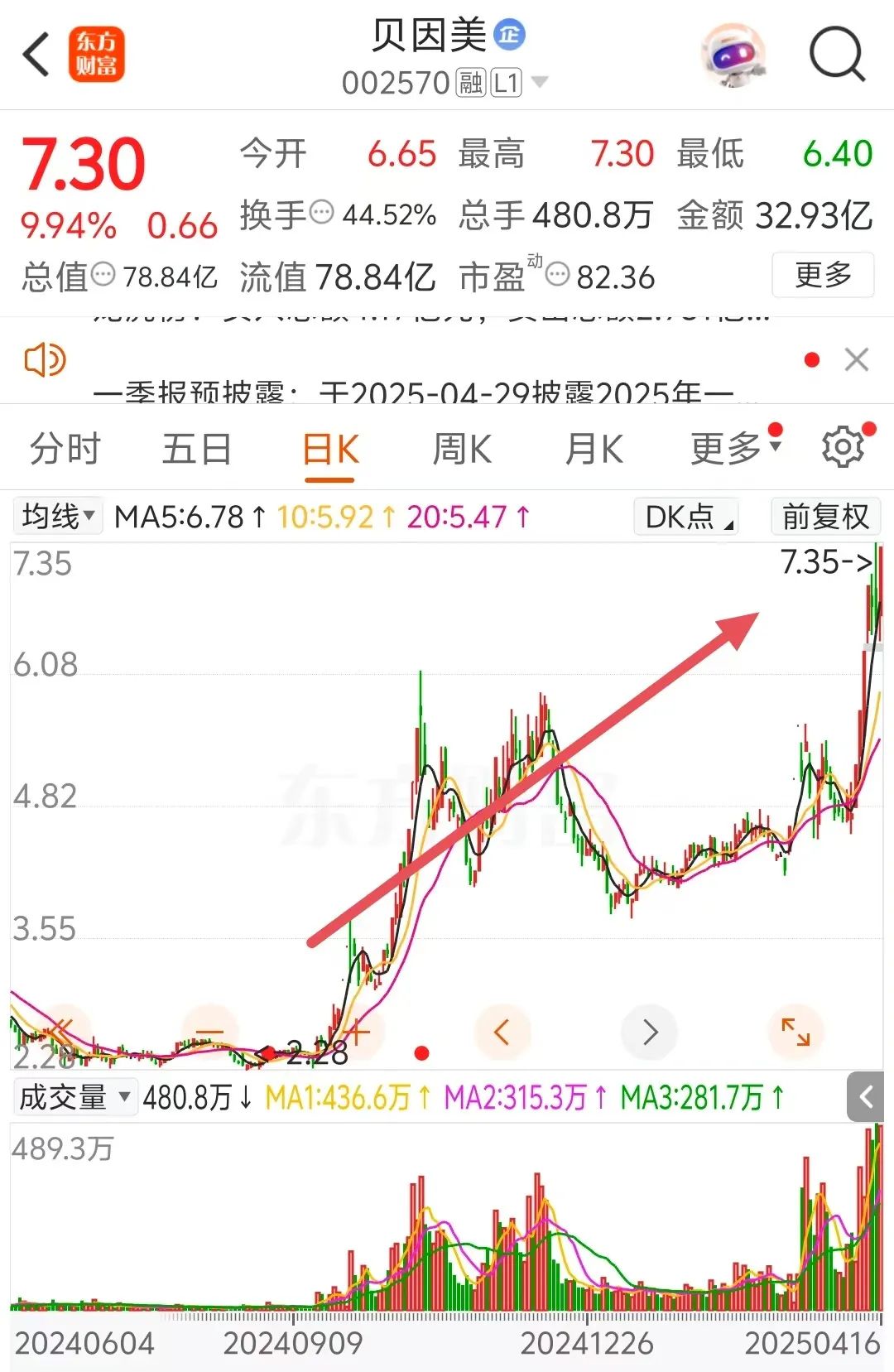 不过,或由于各地出台育儿补贴等消息刺激,近日贝因美股价表现强势,4月16日尾盘快速拉升,再次冲上涨停。这样,7个交易日里贝因美收出5个涨停板。截至4月16日收盘,公司市值达到78.84亿元。自去年9月24日算起,公司股价已上涨近两倍。