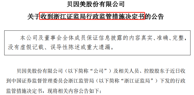 浙江证监局在现场检查中发现贝因美存在三方面问题,公司、公司控股股东及公司时任董事长、财务总监、董秘等均被采取出具警示函的监管措施。