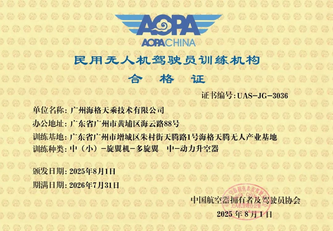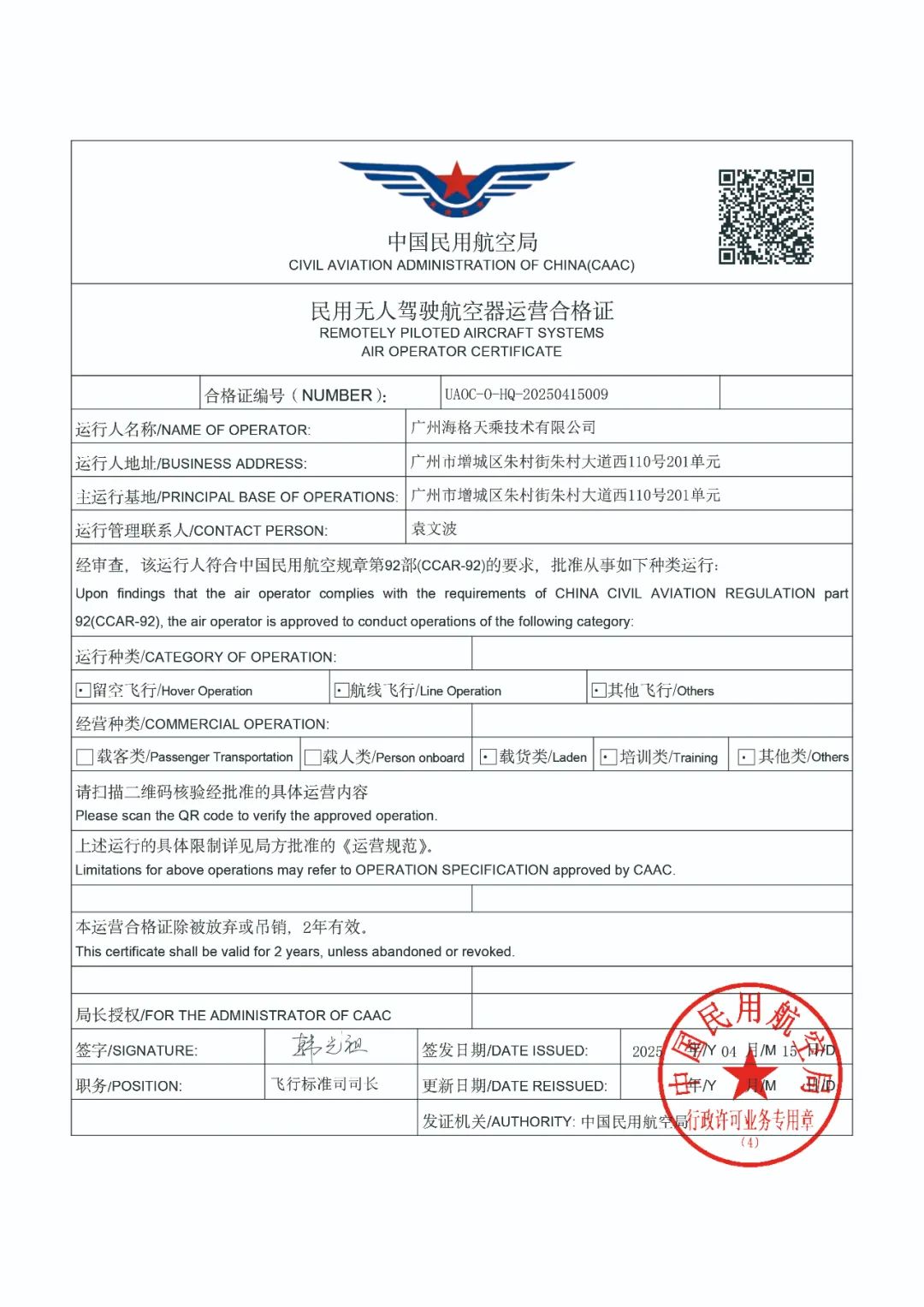 8月11日,据海格通信(002465)(002465.SZ)官微消息,近日,海格通信旗下成员企业广州海格天乘技术有限公司(以下简称“海格天乘”)相继获得《民用无人驾驶航空器运营合格证》、《民用无人机驾驶员训练机构合格证》,成为同时具备无人机运营服务和操控员培训“双证”资质的机构,标志着海格天乘具备安全、合法、合规开展无人机商业运营服务及无人机操控员培训的能力,推动低空经济产业发展迈向新高度。