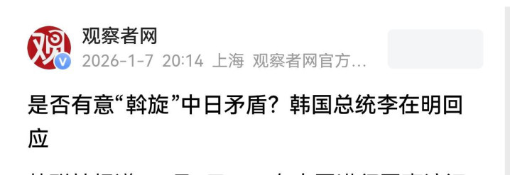 《是否有意“斡旋”中日矛盾?韩国总统李在明回应》——观察者网2026年1月7号20:14